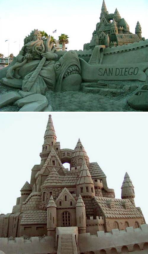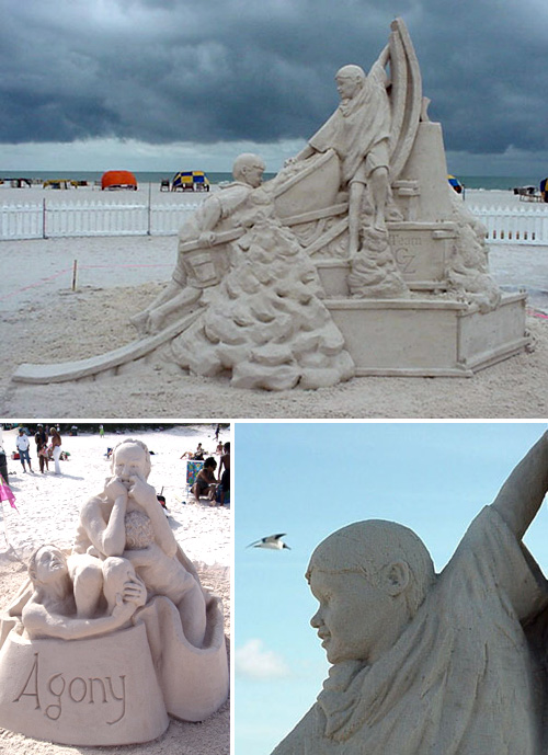 This is a group of professional sand sculptors called Team Sandtastic. They take on a wide range of projects from very small to very large. their site is hard to navigate, but each of the images on the home page will generally take you to a whole other section. Enjoy.